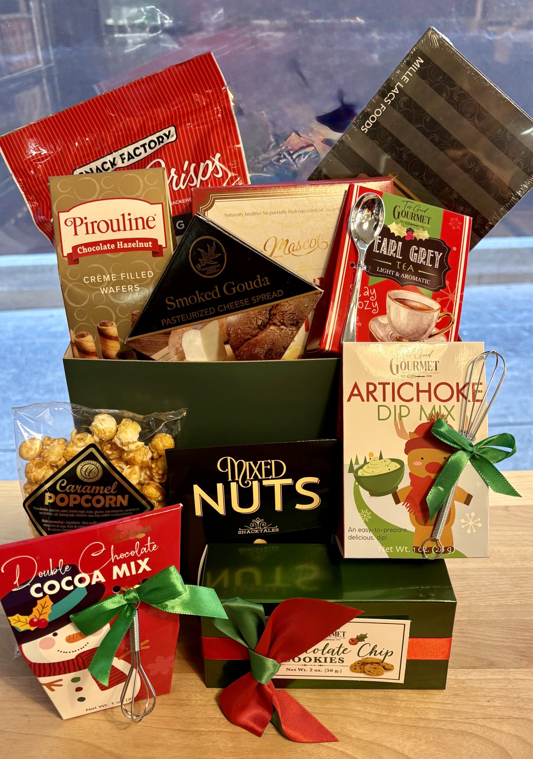 Lavish them with festive tea, cocoa, sumptuous chocolates, dip mix, cheese, cookies, caramel corn, pretzels, peanut brittle and snack mix. We add nuts, soup mix, cookies & more chocolates to the Large.