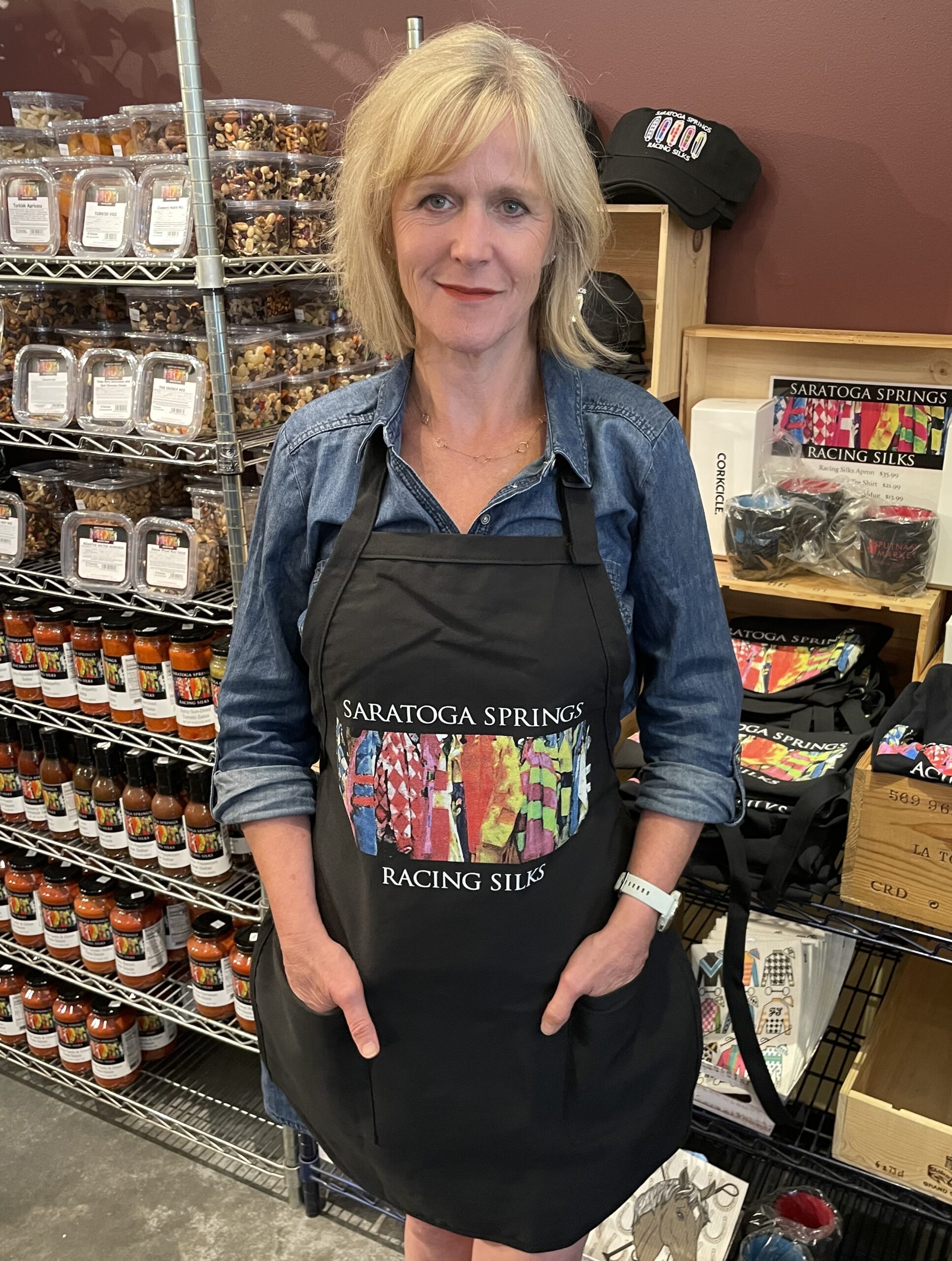 Adjustable apron, one size fits most. Two front pockets. 65% polyester, 35% cotton for washability and durability.