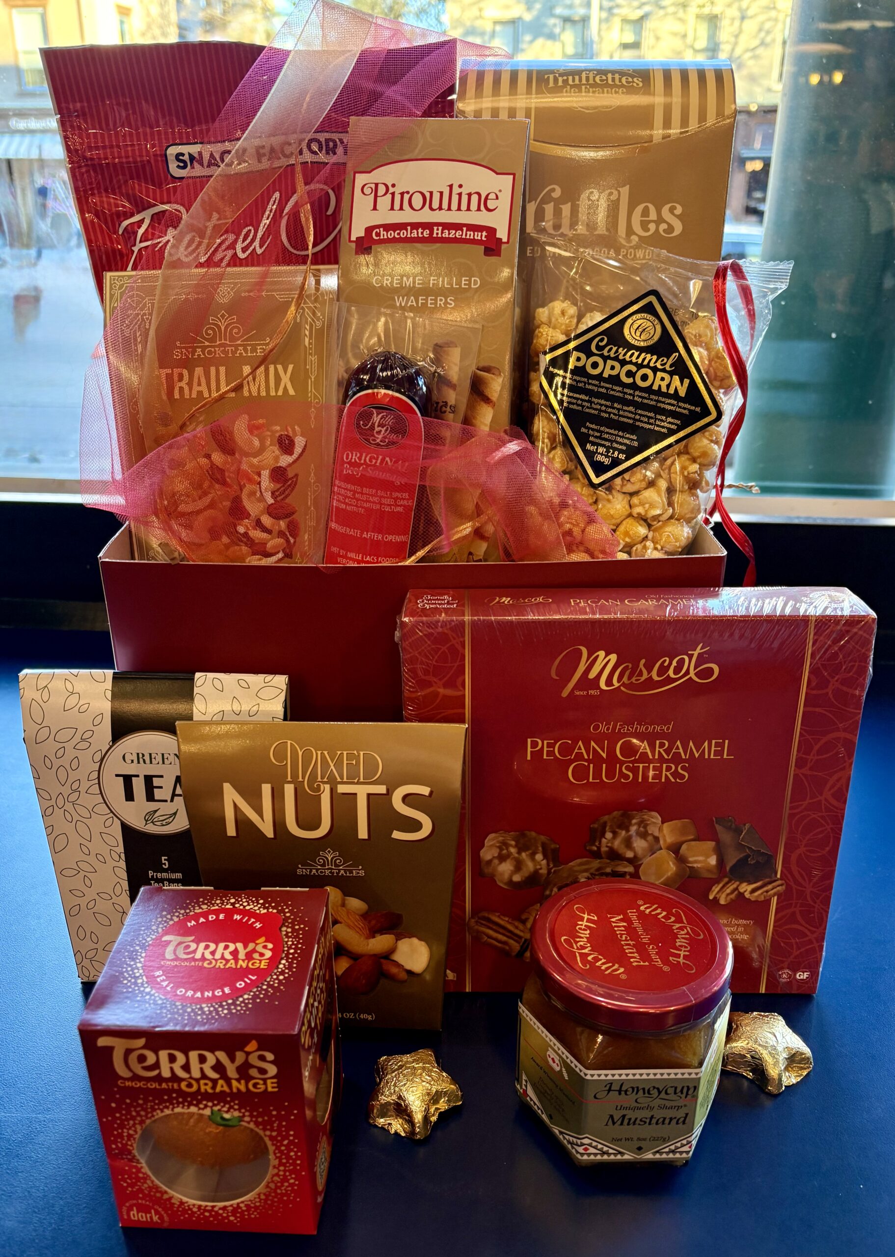 Glittering gold & red. Includes holiday chocolates and cookies, tea, pretzels, honey mustard dip, snack mix, roasted nuts, summer sausage and caramel corn.